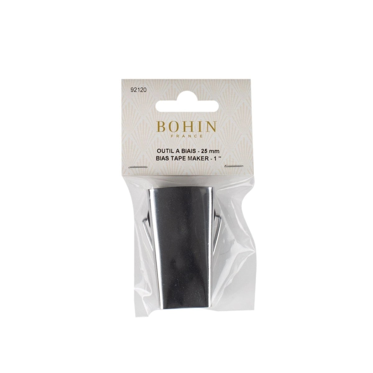 Cet outil de fabrication pour biais BOHIN permet de former n'importe quel ruban en biais destiné à ourler des bords de tissus ou des couvertures en patchwork ! Il vous suffit de glisser l’extrémité de la bande de tissu dans l’appareil à biais (si besoin, aidez-vous d’une épingle ou d’un poinçon pour faciliter le passage du ruban). A l’aide d’un fer à repasser, maintenez le pliage formé par l’appareil à biais. Pour vous guider lors de sa pose, vous pouvez réaliser un dernier pliage du biais à sa moitié.
