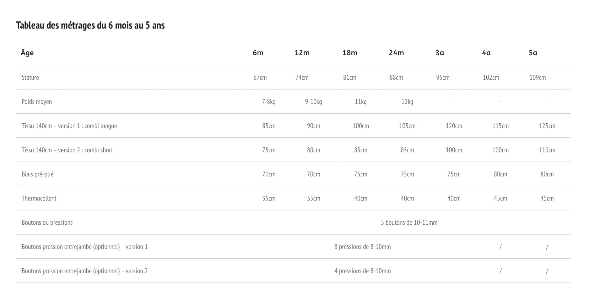 À partir du 3 ans, nous recommandons le choix d’un tissu comportant de l‘élasthane pour les versions longues pour offrir une plus grande aisance aux mouvements des enfants.