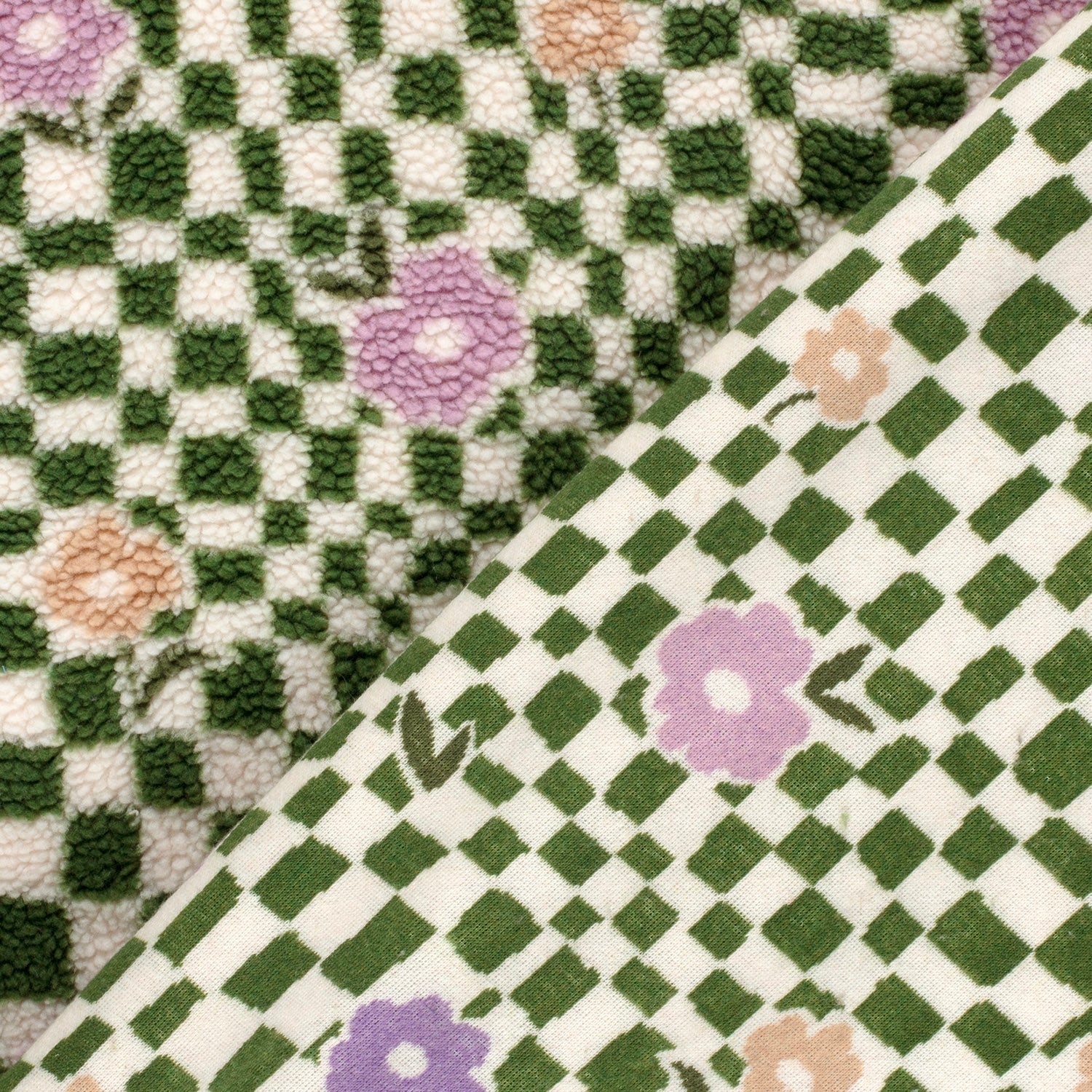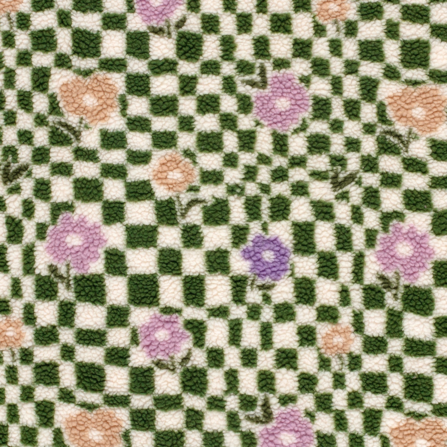 Tissu sherpa à damier irrégulier de couleur vert olive avec des fleurs mauves et oranges.